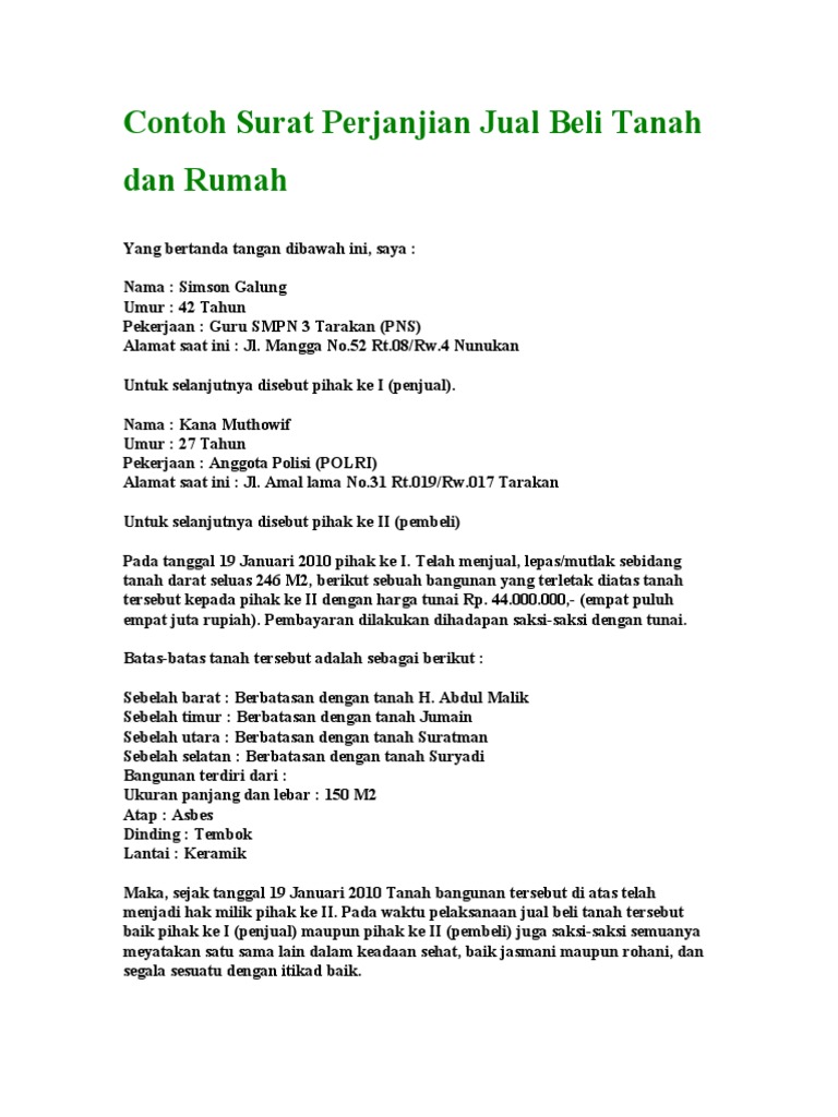 Berikut contoh surat perjanjian jual beli tanah yang bisa kamu ikuti. Perlu diingat, isi dari surat perjanjian tersebut kembali lagi kepada kesepakatan kedua belah pihak. Apabila anda merasa kesulitan dalam membuat surat jual beli tanah, anda dapat menggunakan template contoh surat jual beli tanah sebagai berikut. Namun juga tanah, yang tidak bisa dipungkiri sudah semakin sulit didapatkan. Bentuk surat ini sama seperti contoh surat perjanjian jual beli tanah biasanya, namun pada bagian akhir dilampirkan surat kuasa ahli waris sebagai buktinya. The assortment of images contoh surat perjanjian jual beli tanah dengan dp that are elected straight by the admin and with high resolution (hd) as well as facilitated to download images. Sehingga contoh surat di bawah ini dapat dimodifikasi sesuai dengan kesepakatan antara penjual serta pembeli. Contoh surat jual beli tanah kebun. Surat perjanjian jual beli tanah Beberapa contoh surat jual beli tanah dapat anda simak di bawah ini: Hal tersebut menyebabkan tanah dapat digunakan sebagai investasi jangkan panjang. Namun pada umumnya, hal pernyataan pembebanan biaya ini dibebankan pada pihak kedua atau pembeli. Model surat perjanjian diatas adalah model umum yang berlaku di indonesia namun bukanlah format baku sehingga anda masih bisa memodifikasinya sesuai dengan kebutuhan anda.